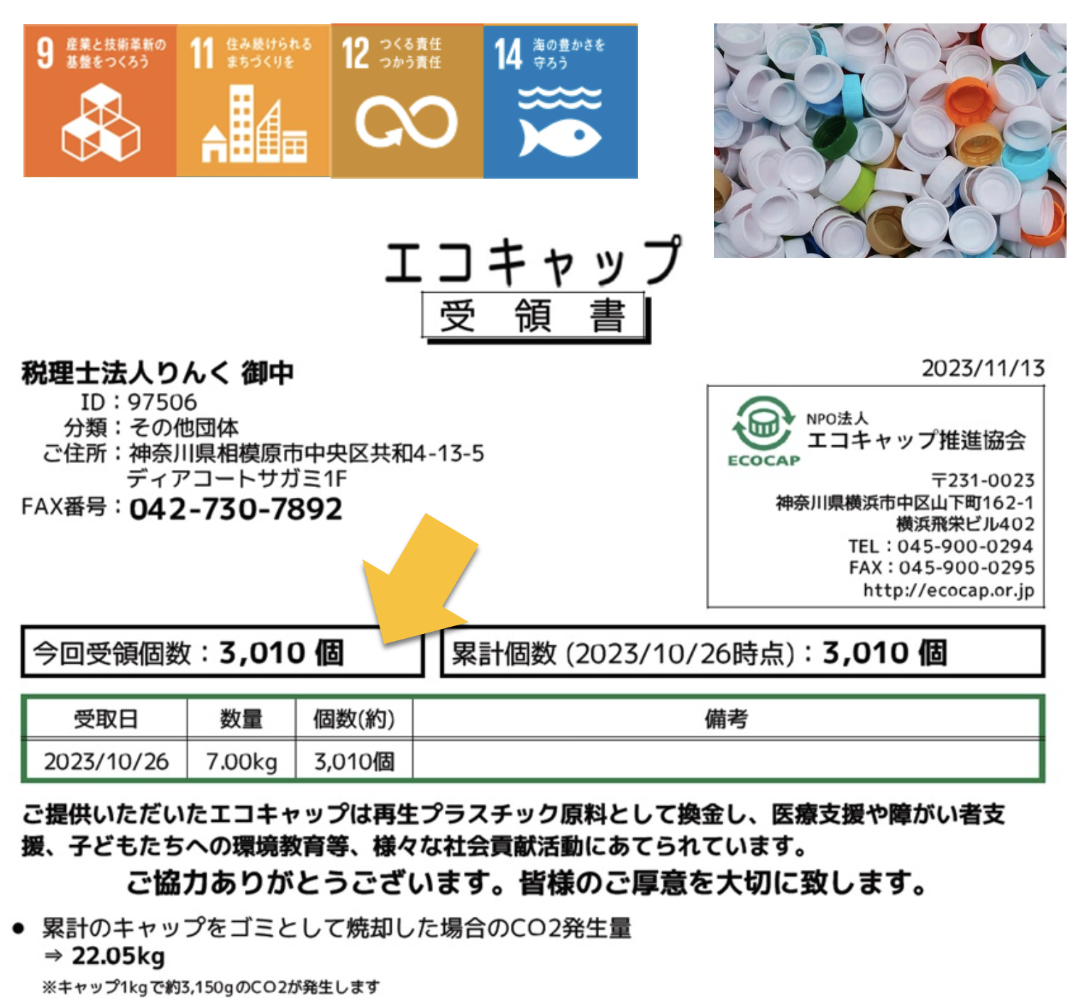 自宅から自主的に 持参してくれる社員も多く、 これからもエコキャップ回収活動を 継続してまいります。